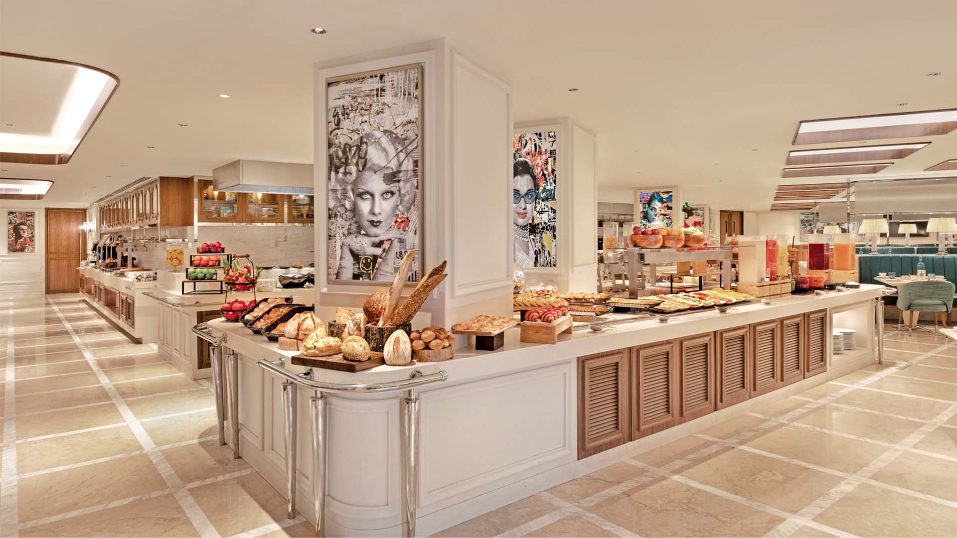 While the hotel’s public spaces articulate the chosen stylistic route clearly and aesthetically, Mirasa is where you can savour the theme at ease. Floor-to-ceiling partitions crafted out of marble and chrome-framed fluted glass, counter-top lamps that grace these dividers and scallop-backed, faux leather banquettes work together to erect a rich, nostalgic atmosphere, bolstered by quirky posters of Hollywood and Bollywood icons. Mirasa’s present footprint is spatial retrofit; its original size was incapable of handling the guest volume that would descend upon it during breakfast—and therefore became a critical area for redressal.