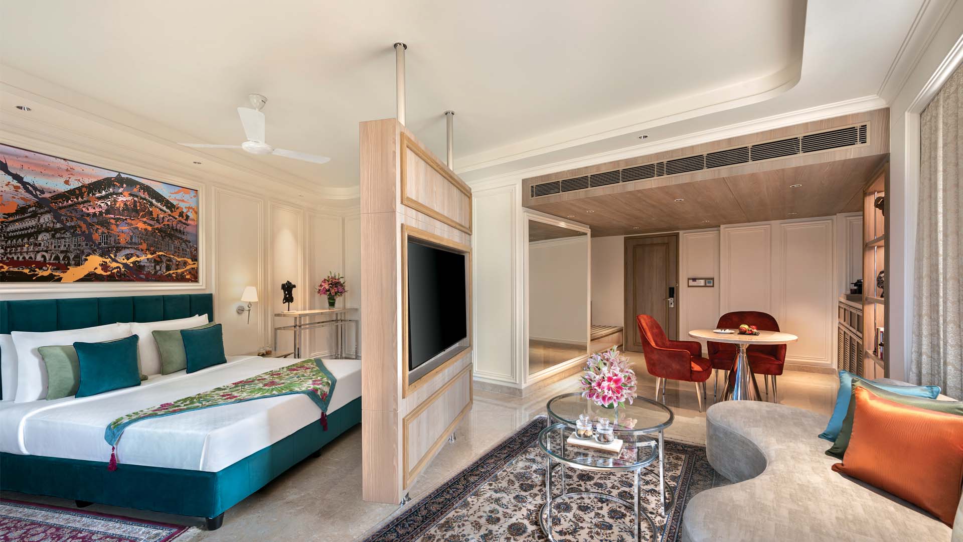The expansive, 150 sq.mtr. Presidential Suite illustrates the strategy of an understated shell populated by vibrant, chromatic elements.
