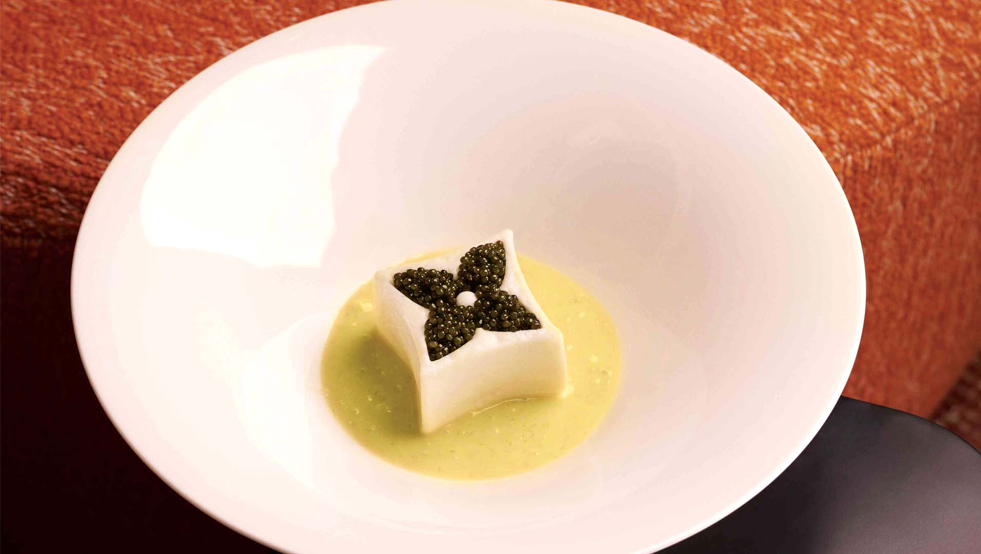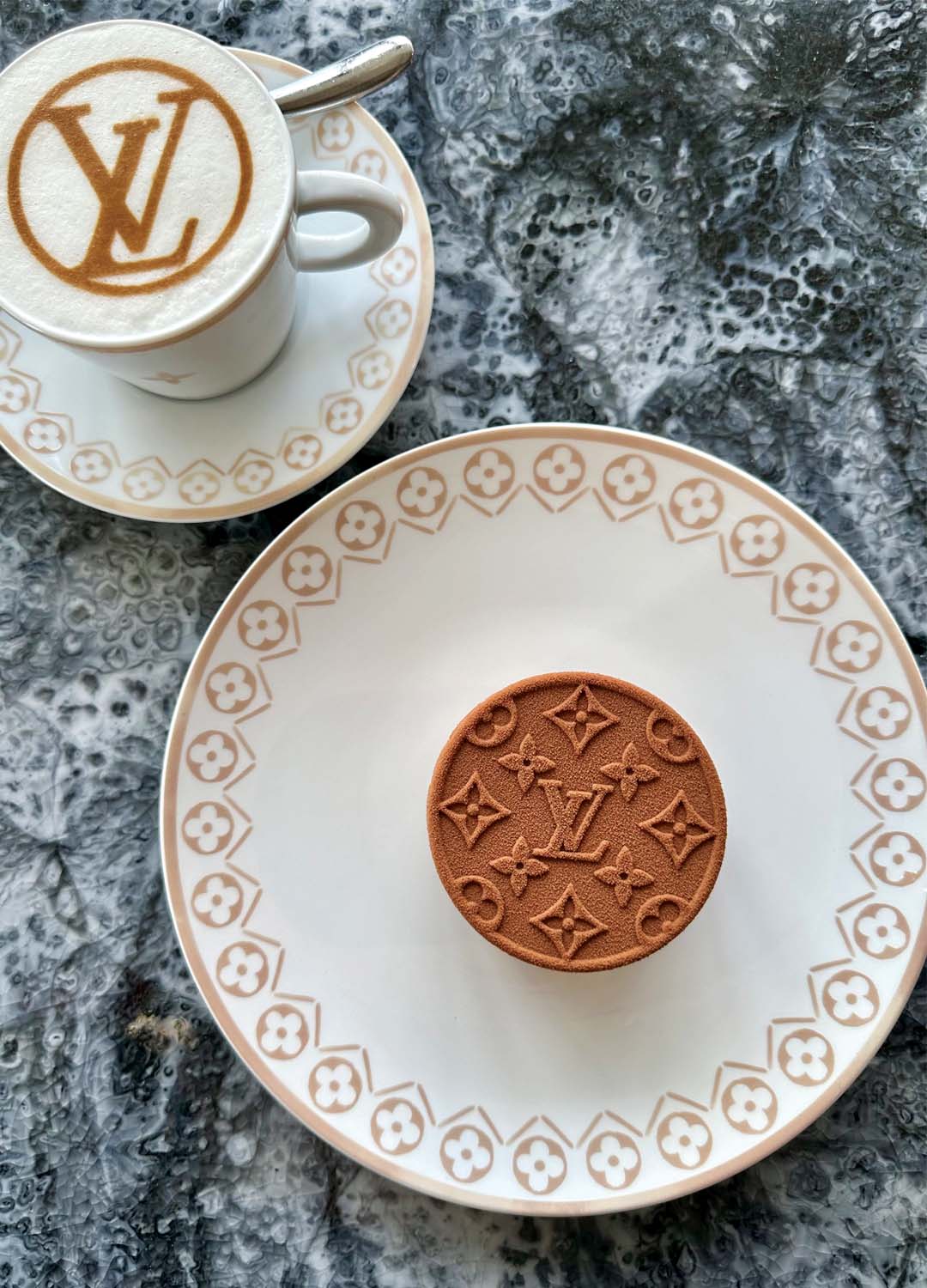 Café Maxime Frédéric at the LV store in Paris, with views of the Seine in Cheval Blanc, a tropical vibe, and LV’s monogrammed aesthetics are perfect setting for luxury snacking; dishes such as Scallop Soufflé (caviar and champagne beurre blanc), Le Croque ‘Louis Paris’ (white ham, Comté cheese, and black truffle) and monogrammed desserts find place on the curated menu.