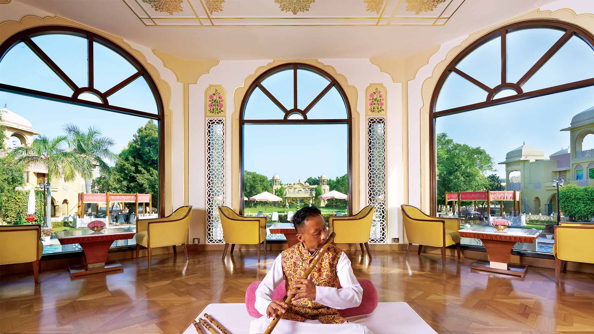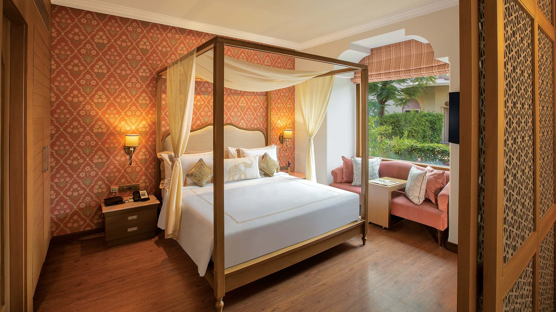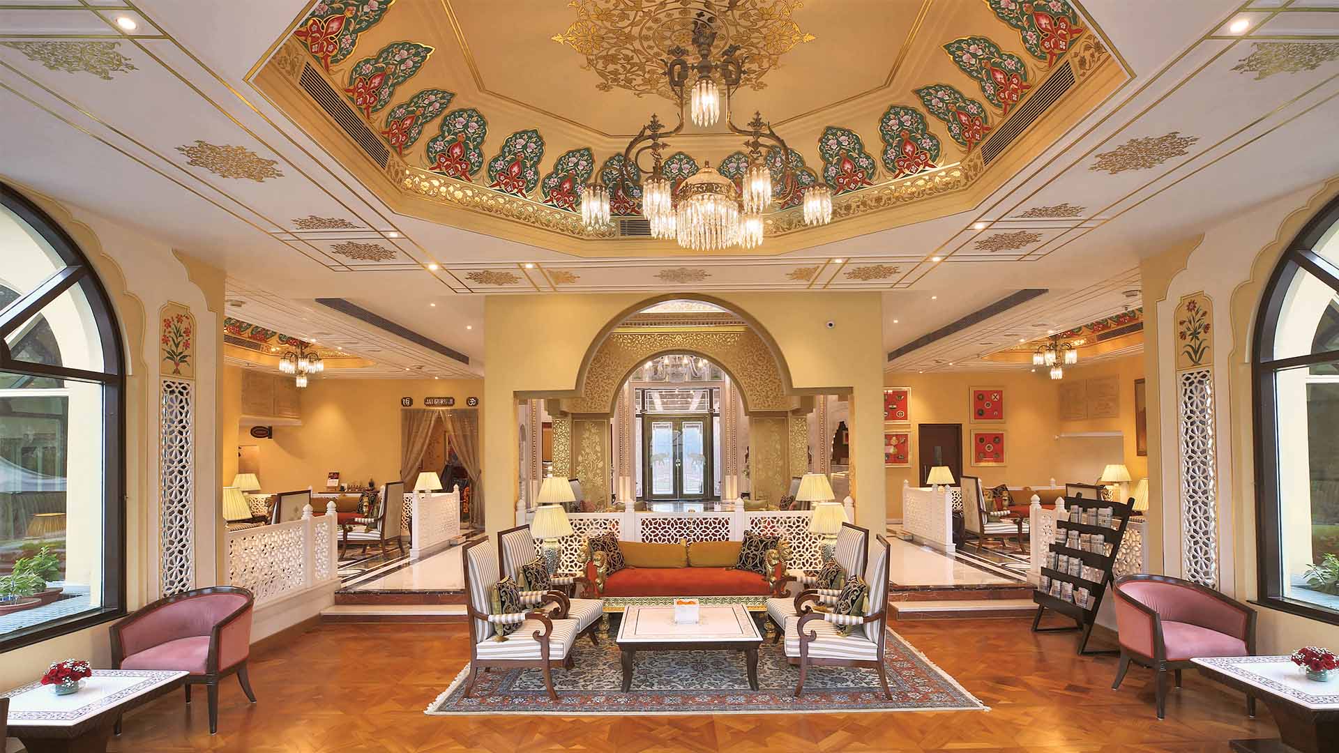 The central block is the beating heart of the resort. A majestic marble-clad lobby, softened with marble lotus motifs and floral decorations brushed by hand, with an occasional glint of gold, complements the luxuriously appointed sofas, all topped by an ornately gilded dome. Gold filigree patterns adorn the striking lattice frames, establishing the Rajasthani connection even more intricately. Art is an intrinsic part of the hotel with marvellous paintings evoking the grandeur of past eras.