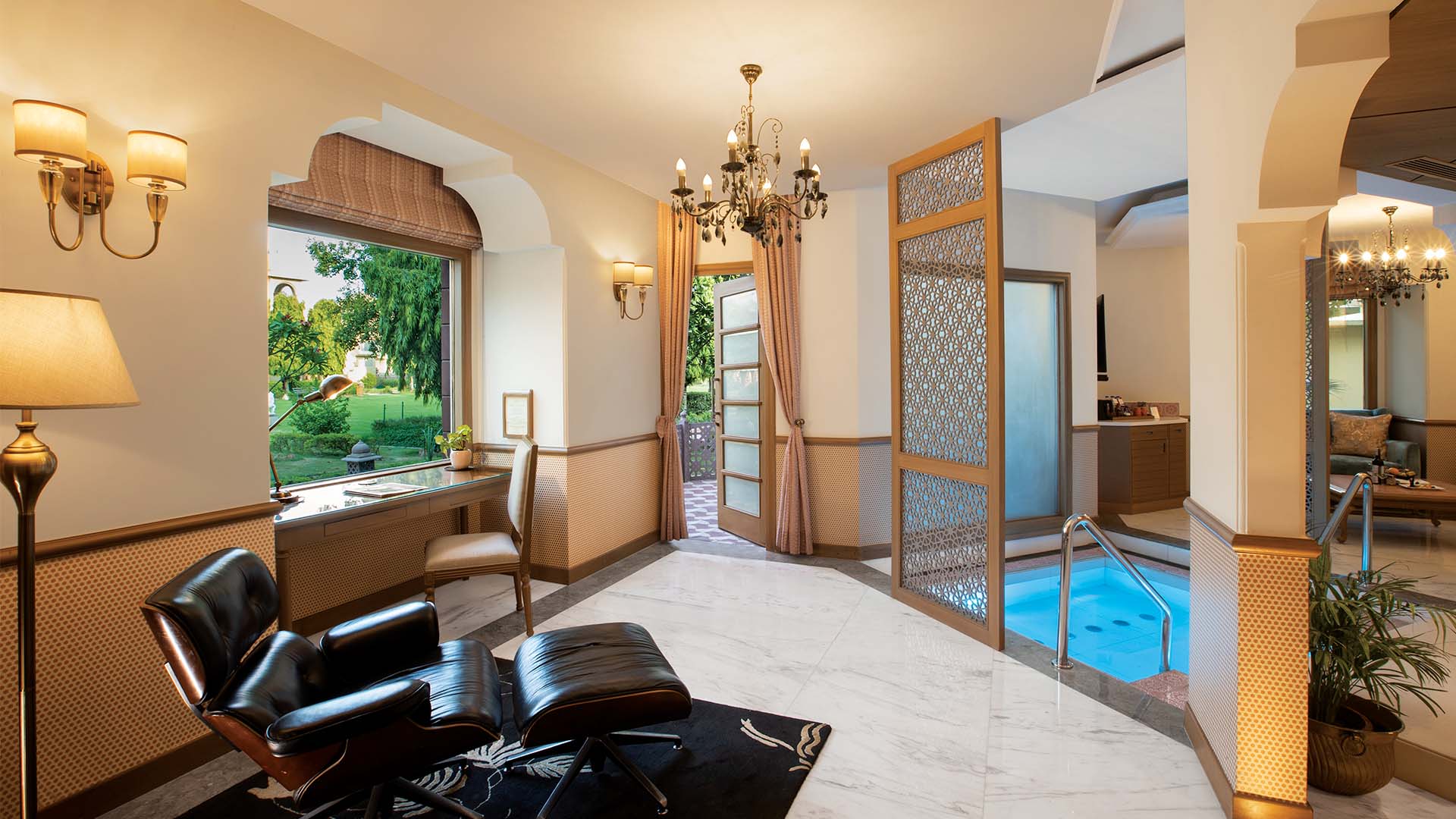 Marble lattice work and gold leafing mark the architectural features of the expansive Aangan Suite.
