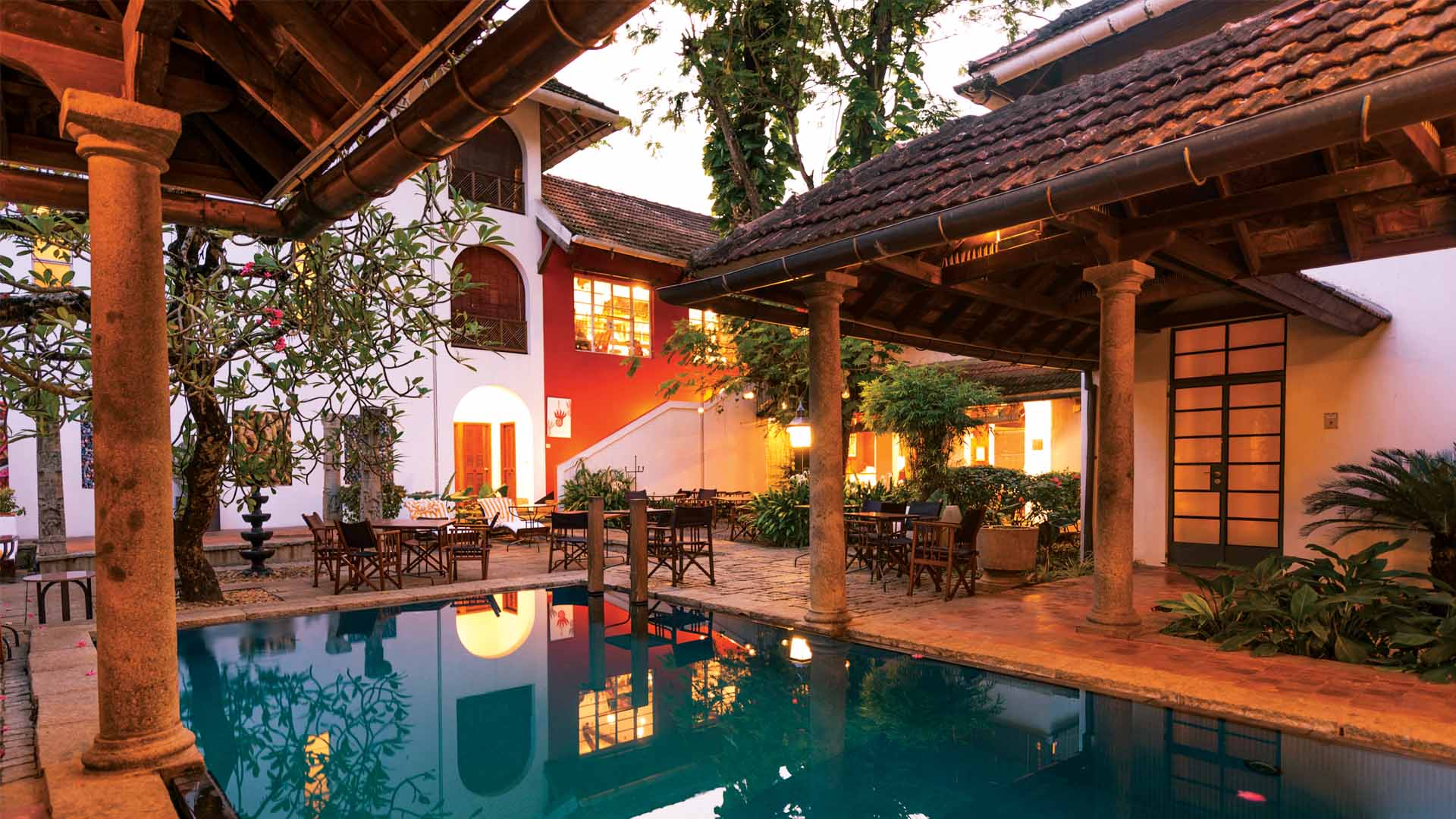 Fort Kochi’s first boutique heritage hotel, Malabar House set the template for intimate, design-led stays in the historic quarter. Created by a German patron, Joerg Drechsel, with a profound affinity for Kerala’s arts and culture, the property has long attracted travellers who value aesthetics, storytelling, and a sense of place. Evenings unfold at an unhurried pace. Divine, the hotel’s wine lounge, is ideal for a quiet glass, while Malabar Junction Restaurant offers imaginative takes on Indian cuisine.